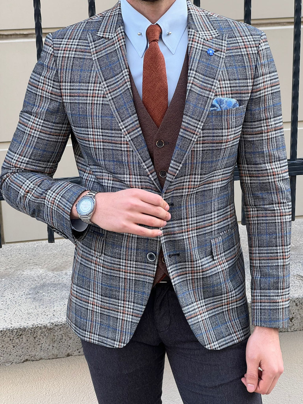 Bojoni Montebello Slim Fit High Quality Plaid Woolen Grey Blazer